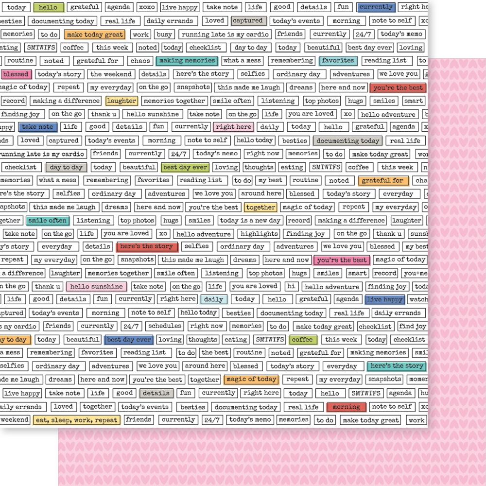 This package contains 20- 12x12 inch double-sided pattern papers, 2- 12x12 inch double-sided borders papers, 2- 12x12 inch double-sided daily details papers and one doohickey 12x12 inch sticker sheet.